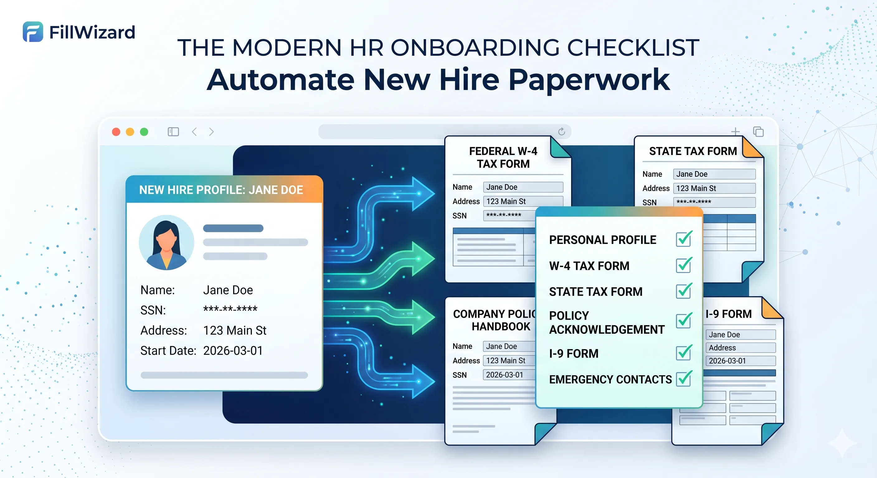 A platform like FillWizard is built for this. You select the employee's profile, select the onboarding packet, and the software instantly populates every relevant field across all documents. Name, address, SSN, start date—it all appears in the right place, perfectly consistent.